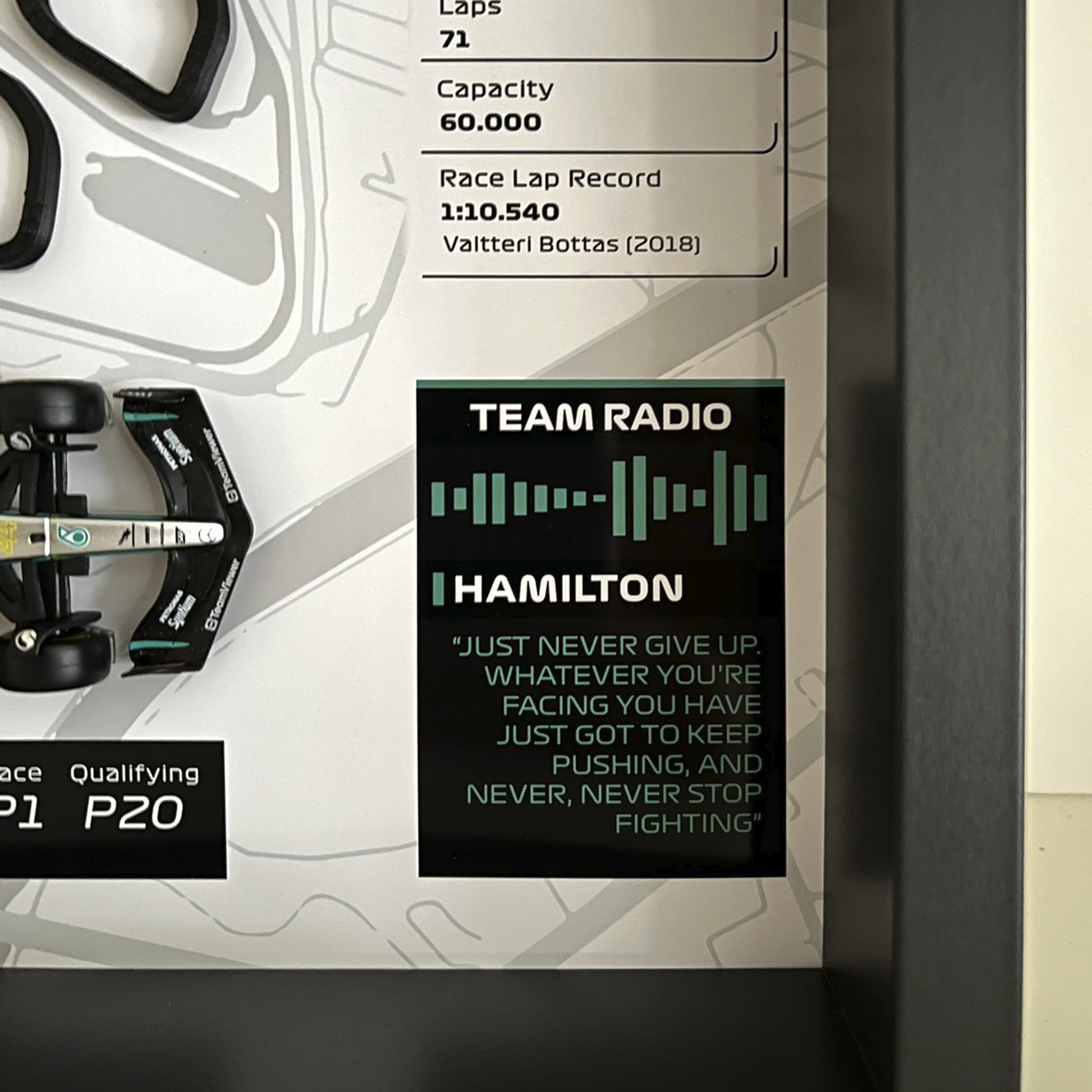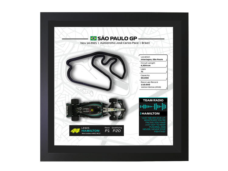 ¡Vuelve a vivir la legendaria victoria de Hamilton en el Gran Premio de Brasil de 2021! Celebra el fin de semana legendario de Lewis Hamilton en Interlagos, comenzando desde la P20 en la carrera sprint, luchando hasta la P5, y luego lanzándose desde la P10 el domingo a una victoria inolvidable sobre Max Verstappen, con la icónica cita de radio de Hamilton: "JUST NEVER GIVE UP. WHATEVER YOU'RE FACING YOU HAVE JUST GOT TO KEEP PUSHING, AND NEVER, NEVER STOP FIGHTING!". Considerada una de las mejores actuaciones en la historia de la Fórmula 1, esta épica actuación ahora se captura en un impresionante tributo de arte mural 3D.