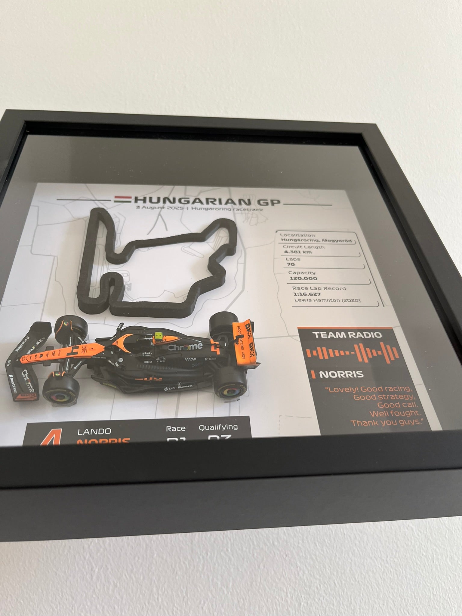 ¡Revive la emoción del Gran Premio de Hungría de 2025! Celebra la victoria inolvidable de Lando Norris en el circuito Hungaroring, donde luchó desde la P3 hasta la P1, con este impresionante cuadro mural 3D que captura el legendario circuito húngaro con exquisito detalle junto al monoplaza McLaren a escala 1:43.