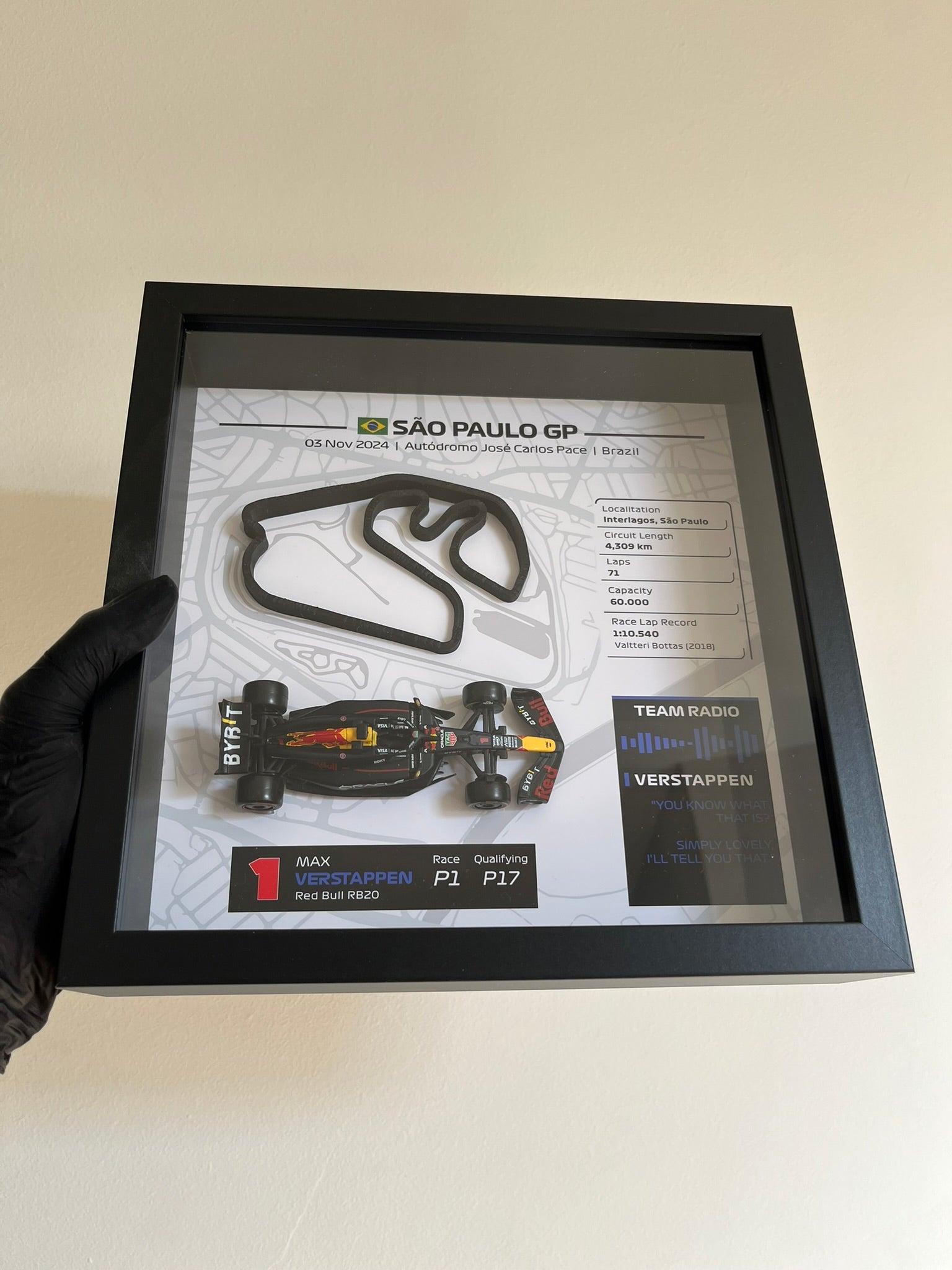 ¡Revive la emoción del Gran Premio de São Paulo de 2024! Celebra la increíble remontada de Max Verstappen desde la P17 hasta la P1 en Interlagos con este impresionante cuadro 3D, que captura el legendario circuito brasileño con detalle y el icónico mensaje de radio de Verstappen: "YOU KNOW WHAT THAT IS? SIMPLY LOVELY, I'LL TELL YOU THAT."
