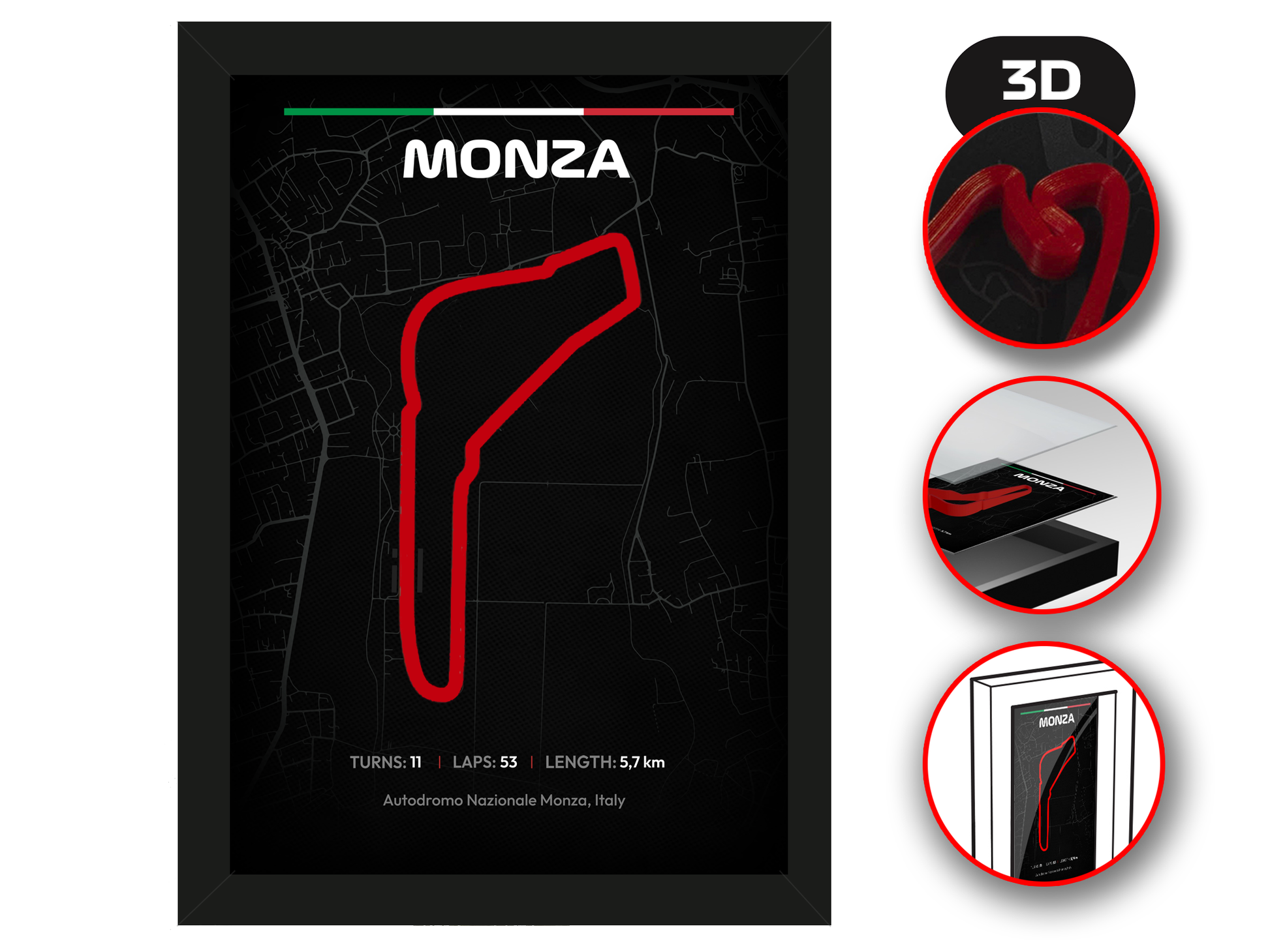 Circuito impreso en 3D: El icónico circuito de Monza cobra vida con un modelo rojo de PLA impreso en 3D, destacando sus rectas vertiginosas y legendarias curvas como Variante del Rettifilo, Lesmo y Parabolica. El diseño en relieve agrega profundidad y dinamismo a la pieza.