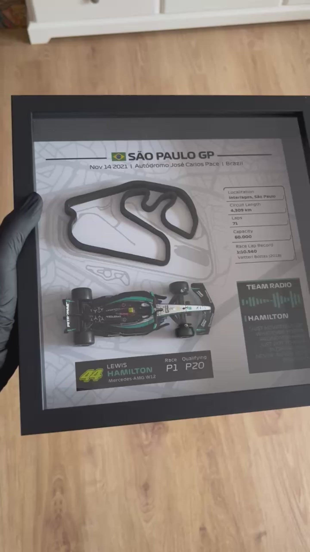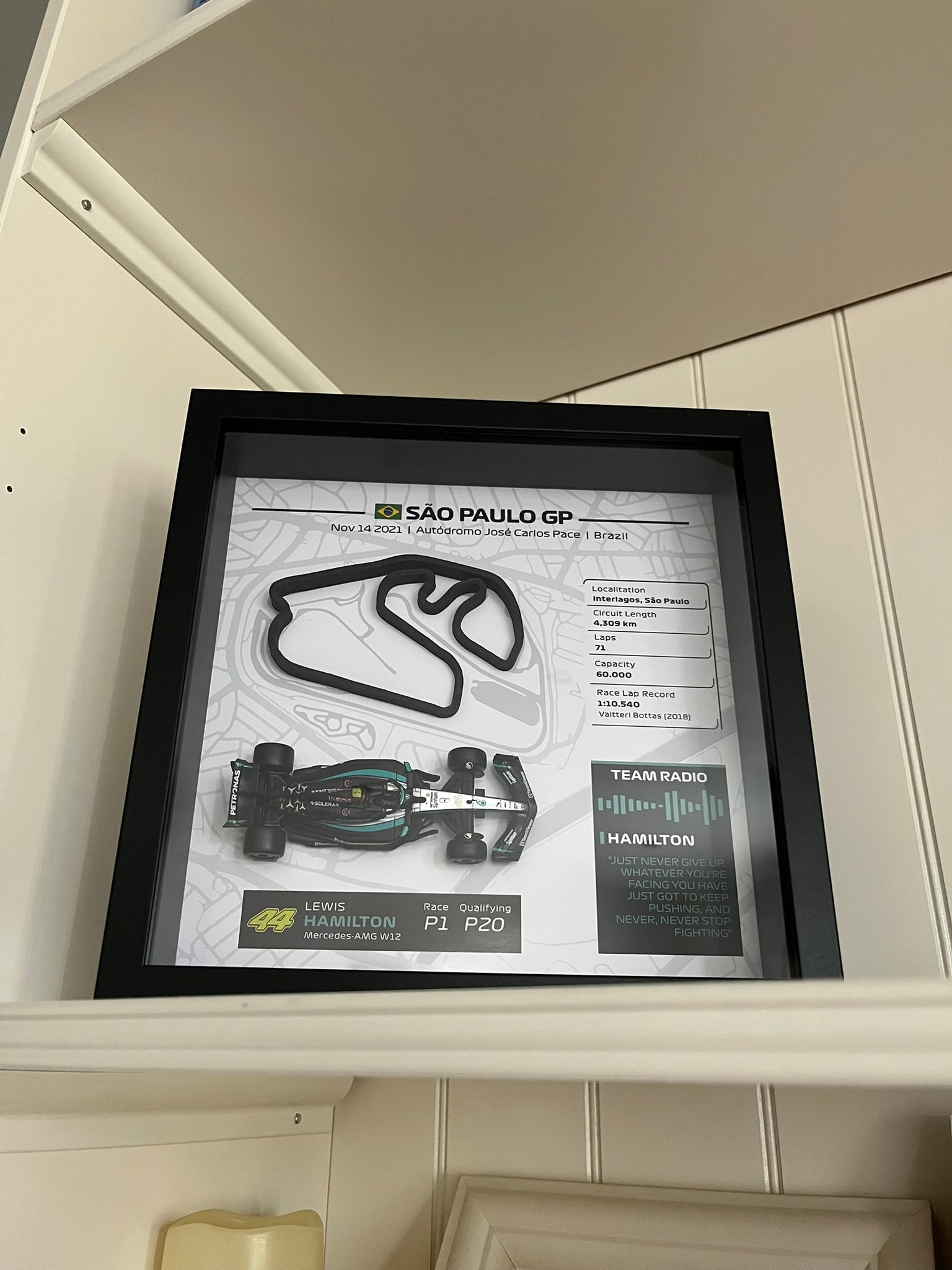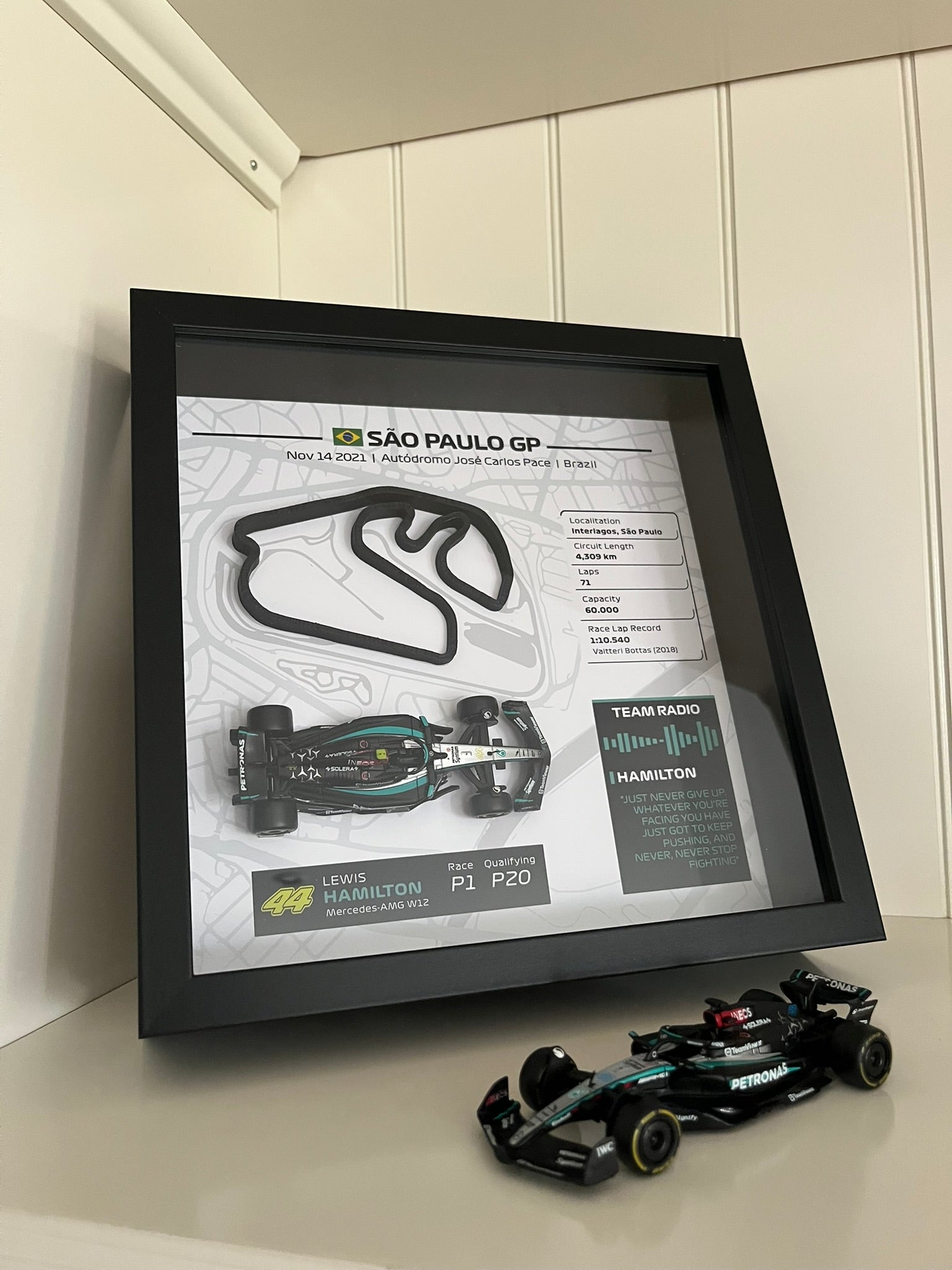 ¡Vuelve a vivir la legendaria victoria de Hamilton en el Gran Premio de Brasil de 2021! Celebra el fin de semana legendario de Lewis Hamilton en Interlagos, comenzando desde la P20 en la carrera sprint, luchando hasta la P5, y luego lanzándose desde la P10 el domingo a una victoria inolvidable sobre Max Verstappen, con la icónica cita de radio de Hamilton: "JUST NEVER GIVE UP. WHATEVER YOU'RE FACING YOU HAVE JUST GOT TO KEEP PUSHING, AND NEVER, NEVER STOP FIGHTING!". Considerada una de las mejores actuaciones en la historia de la Fórmula 1, esta épica actuación ahora se captura en un impresionante tributo de arte mural 3D.