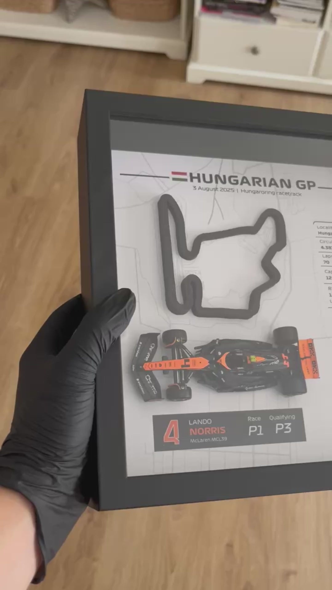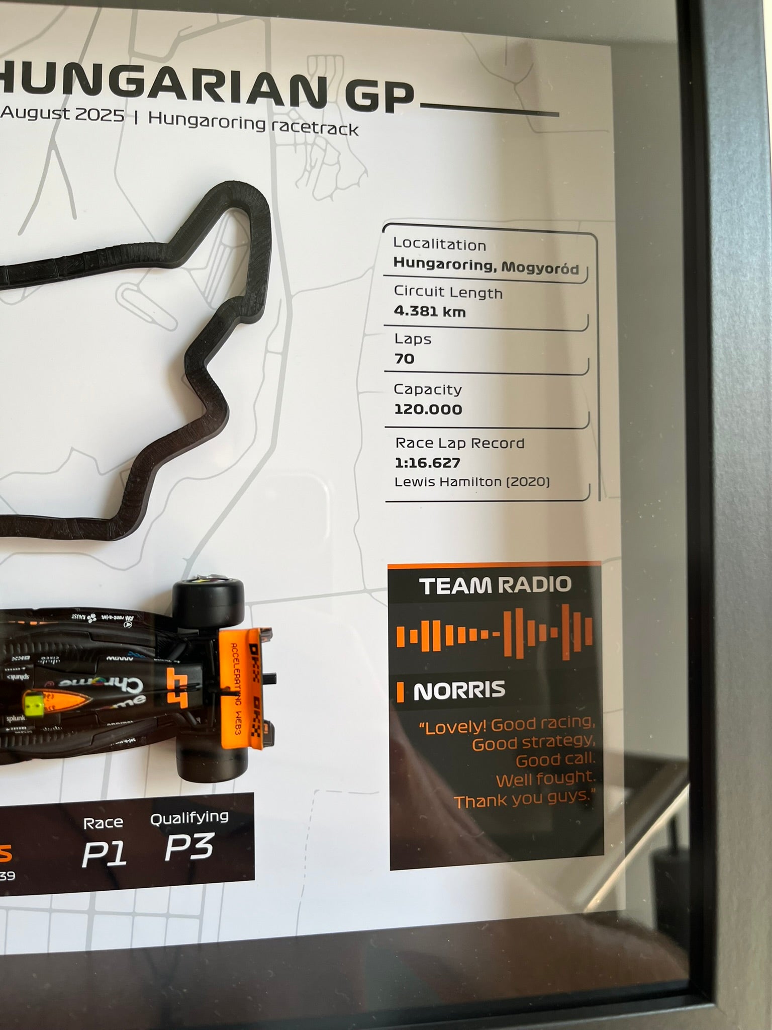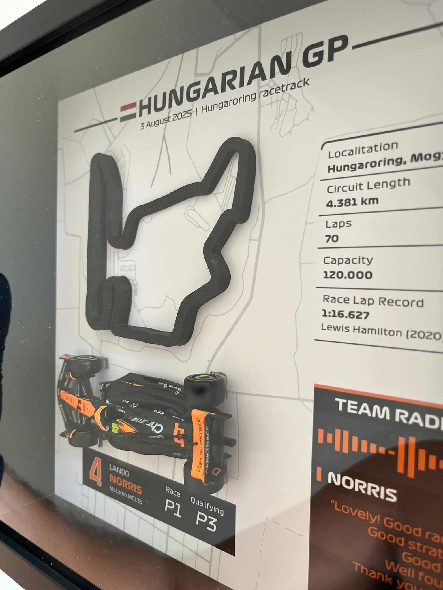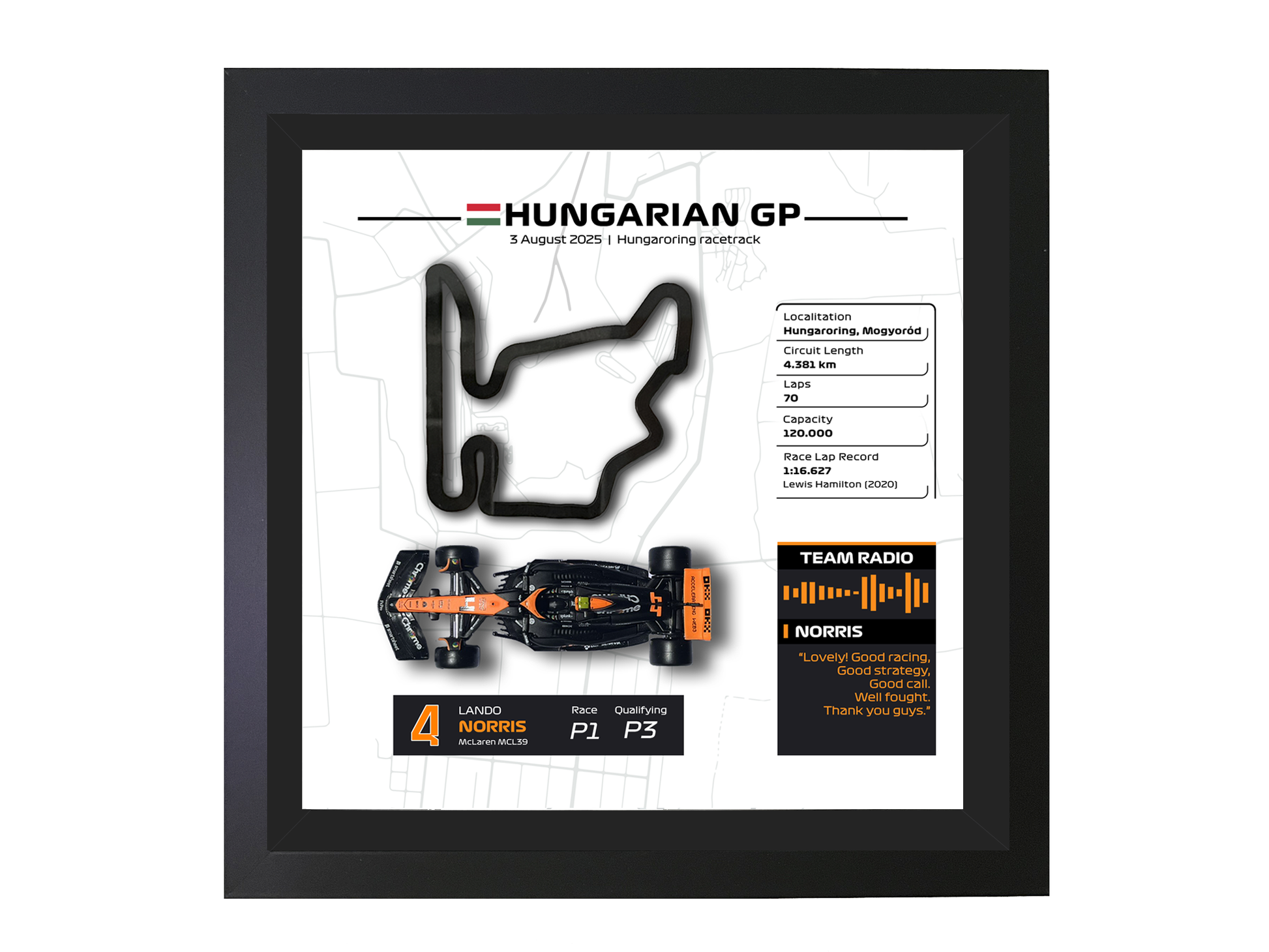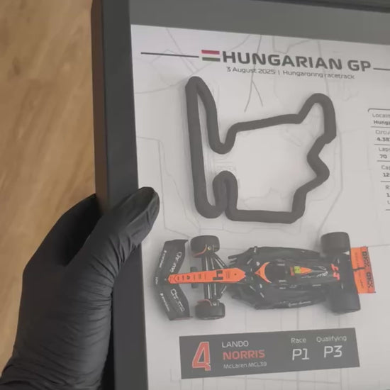 ¡Revive la emoción del Gran Premio de Hungría de 2025! Celebra la victoria inolvidable de Lando Norris en el circuito Hungaroring, donde luchó desde la P3 hasta la P1, con este impresionante cuadro mural 3D que captura el legendario circuito húngaro con exquisito detalle junto al monoplaza McLaren a escala 1:43.