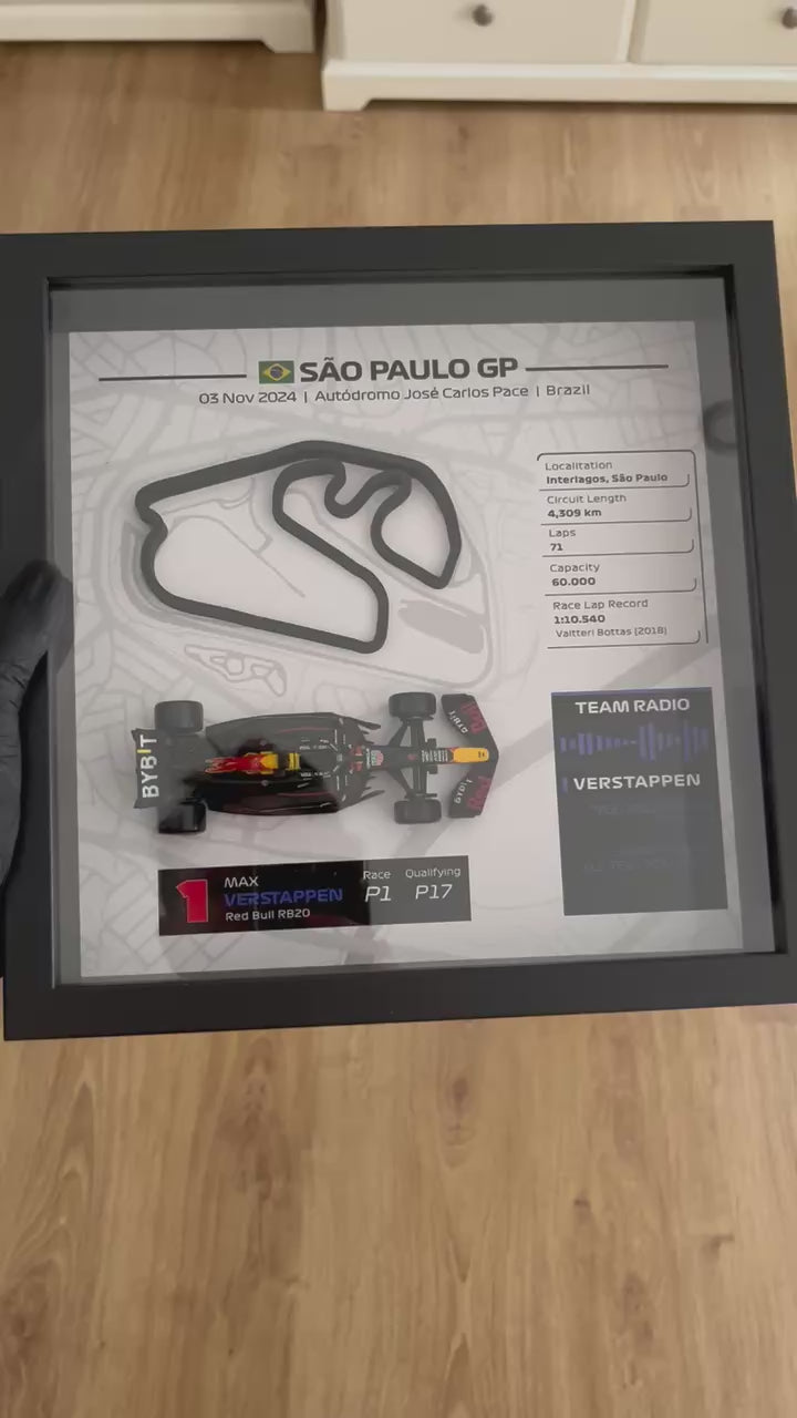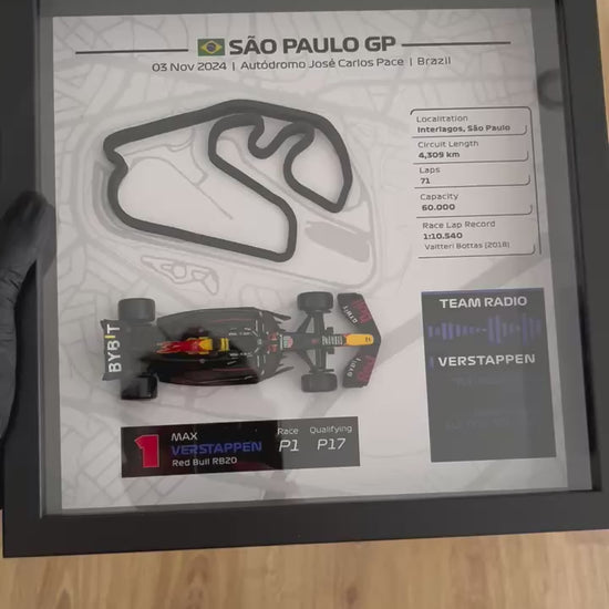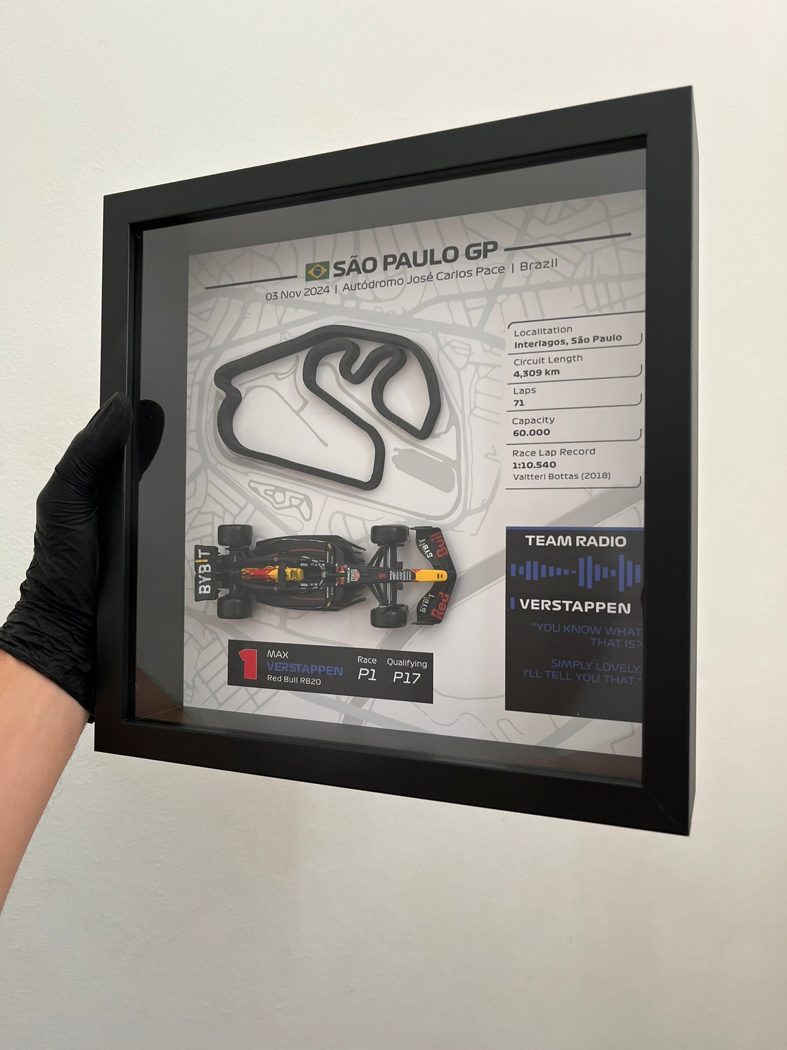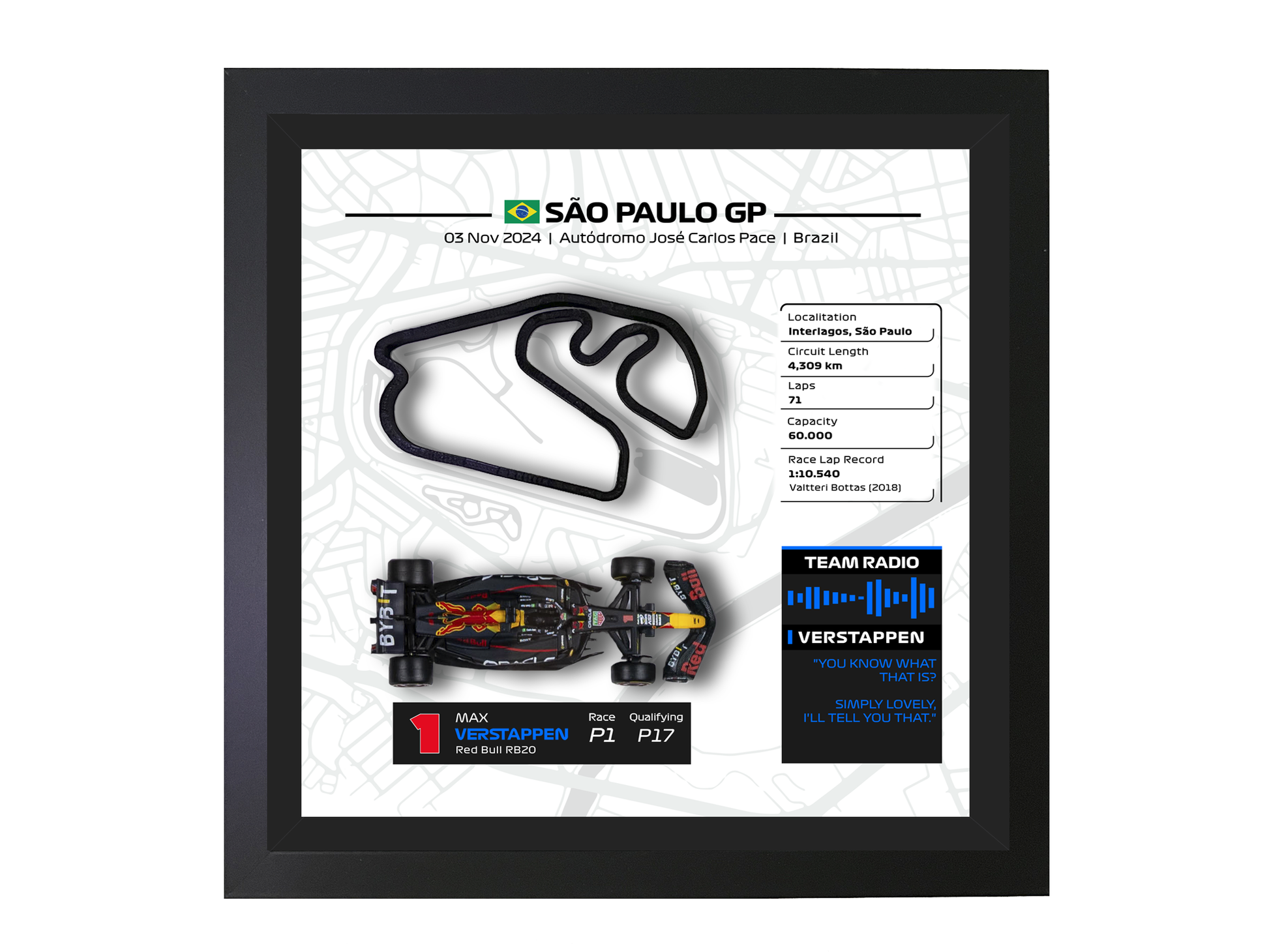 ¡Revive la emoción del Gran Premio de São Paulo de 2024! Celebra la increíble remontada de Max Verstappen desde la P17 hasta la P1 en Interlagos con este impresionante cuadro 3D, que captura el legendario circuito brasileño con detalle y el icónico mensaje de radio de Verstappen: "YOU KNOW WHAT THAT IS? SIMPLY LOVELY, I'LL TELL YOU THAT."